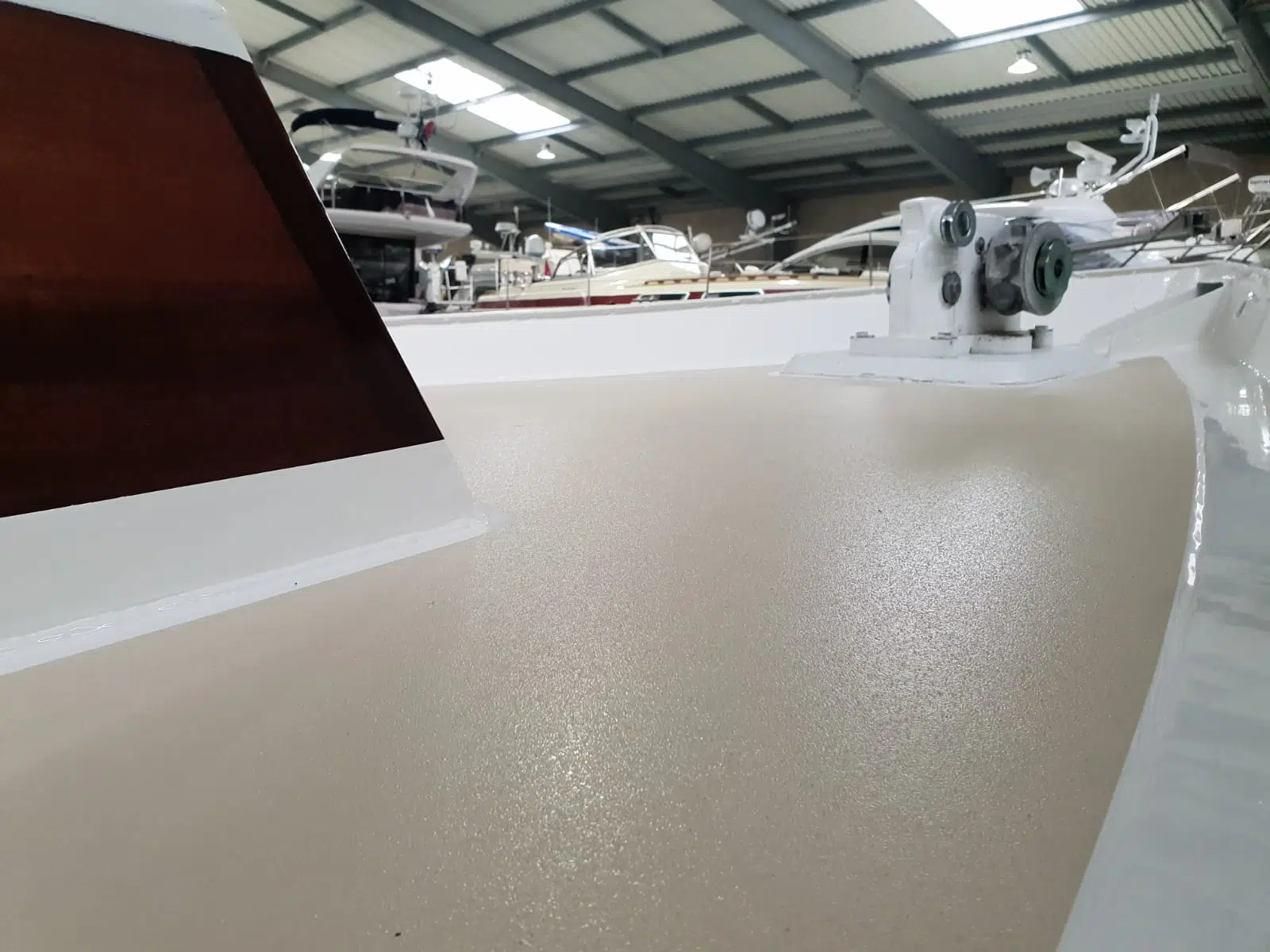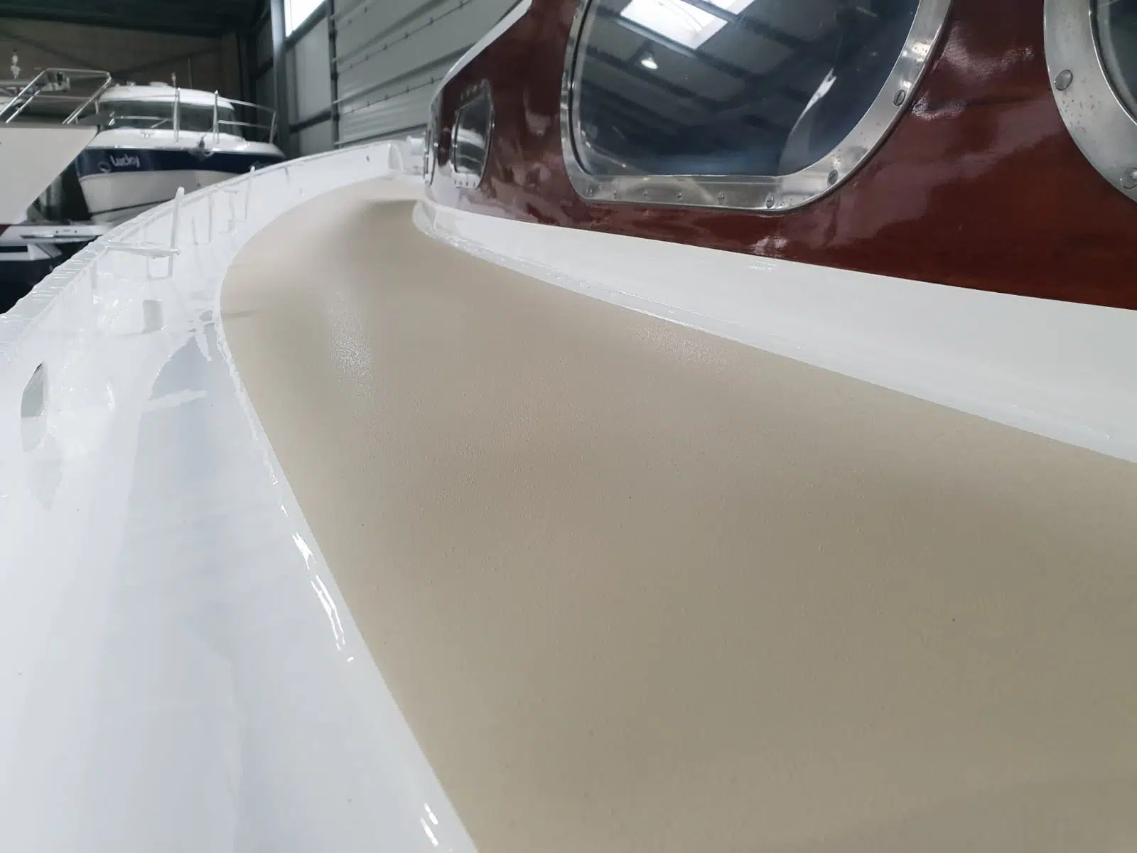 Alte, oft unterwanderte Beläge werden restlos entfernt. Im Rahmen des Neuaufbaus setzen wir in den Laufbereichen auf bewährte TBS-Beläge (oder vergleichbare Systeme). Diese werden mit Spezialkleber aufgebracht. Sie sind extrem rutschfest, langlebig und bieten den Vorteil, dass sie bei Beschädigung partiell ausgetauscht werden können, ohne das ganze Deck neu lackieren zu müssen.