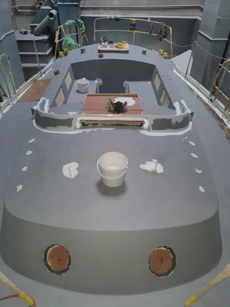 Ja, ohne Ausnahme. Das Deck muss komplett "nackt" sein (gestrippt). Die gefährlichsten Korrosionsnester sitzen fast immer unter den Klampen, Winschen, Schienen oder Lukenrahmen. Würden wir drumherum arbeiten, käme der Rost nach kurzer Zeit genau dort wieder hervor. Wir demontieren alles, verpacken das Schiff staubdicht und remontieren es nach der Beschichtung fachgerecht.