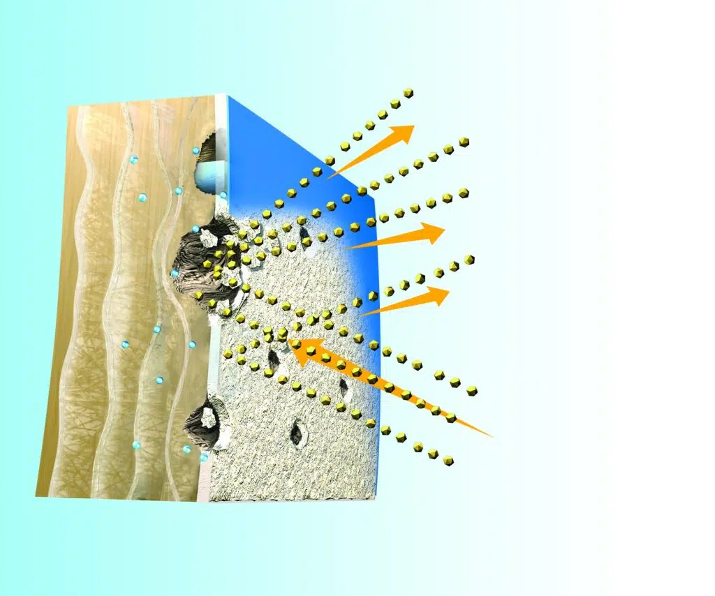 - Strahlmittel mit relativ großer Masse schlägt auf das Gelcoat auf. Dadurch sprengt es mit Feuchtigkeit gefüllte Hohlräume auf. Bereiche mit intaktem Gelcoat werden nur aufgeraut.