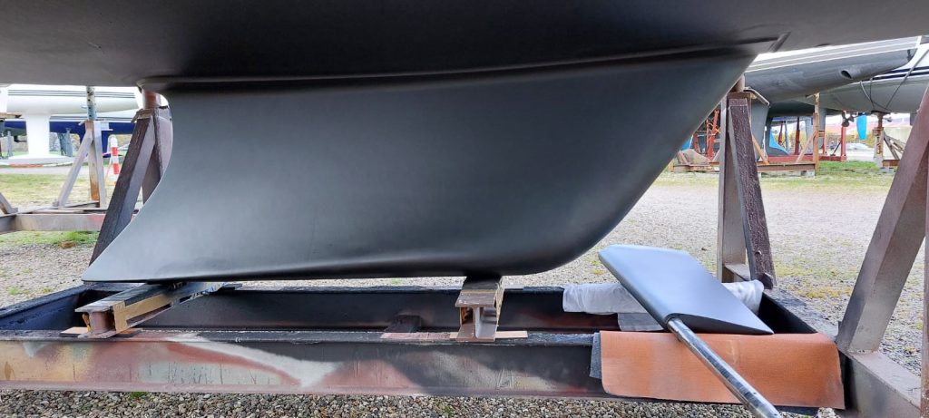 Nach vollständiger Aushärtung der Verbindung wird das Boot wieder auf den Kiel gesetzt und die Konstruktion erneut auf Druck belastet. Bei Metallkielen folgt anschließend der weitere Aufbau mit Epoxidspachtel und einer schützenden Epoxid-Korrosionsbeschichtung.
